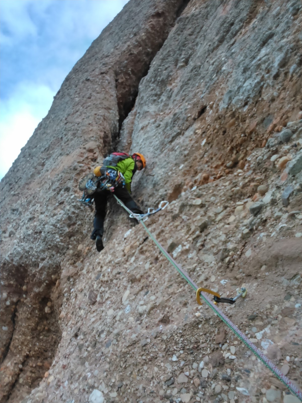 L1, lo escala Mari. Tramo de unos 30m, que comienza franqueando a la izquierda a buscar unos pitones que nos llevarán al inicio de la fisura tan marcada que se ve desde abajo, roca un tanto descompuesta con un paso de 6a/A0 que encontramos antes de llegar a la R.